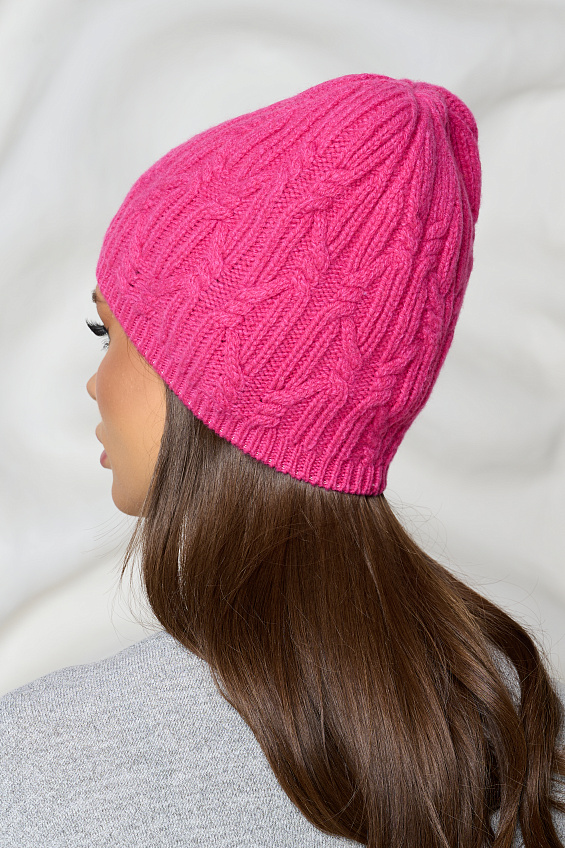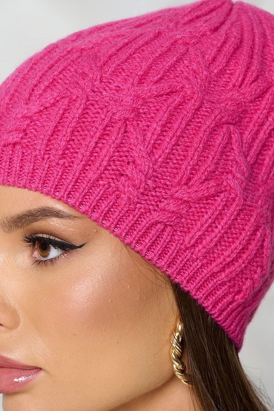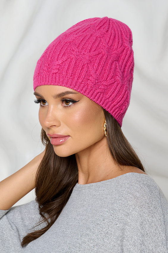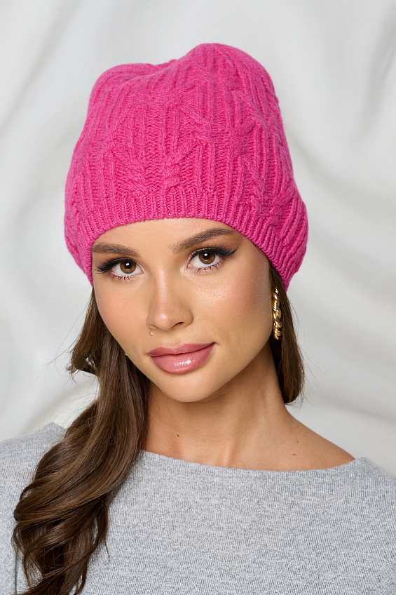 Шапка тёплая цвета фуксия от производителя Bellovera. Фигурная вязка добавит атмосферного настроения и согреет в прохладную погоду.