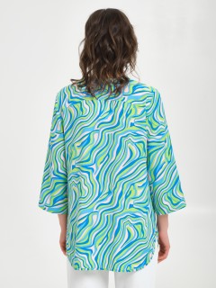 Блуза голубого цвета с рукавом 3/4 от фабрики Priz. Модель прямого силуэта, выполнена из текстильного полотна. Вырез горловины V-образный, подчёркнут фигурной планкой. Спереди накладные карманы с застежкой на петлю и пуговицу. Спинка с отрезной кокеткой, переходящей на перед. Низ блузки фигурный, обработан окантовкой. Комфорт и стиль на каждый день.
