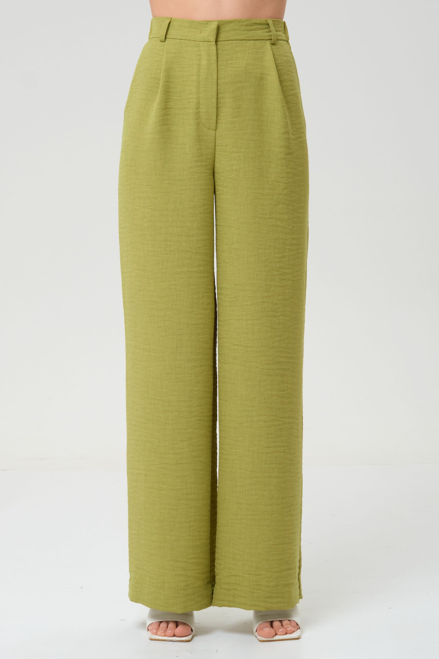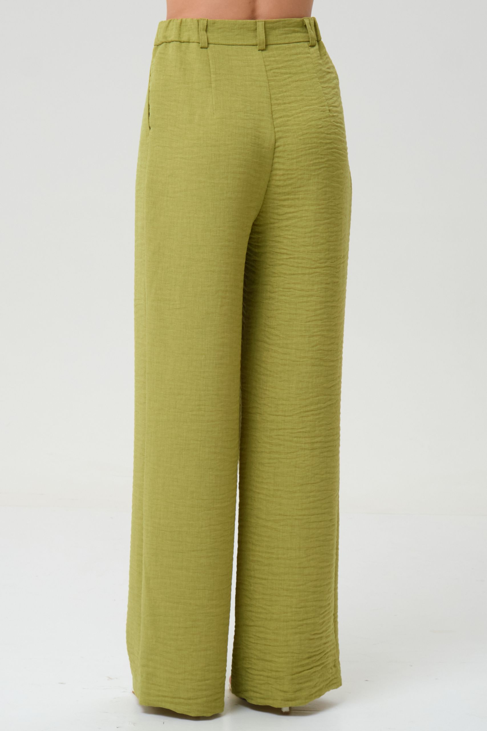Брюки свободного кроя с карманами от фабрики Priz, выполнены из текстильного полотна в ярком зелёно-жёлтом цвете. Модель на эластичном поясе со шлёвками. Спереди защипы, застёжка на молнию и пуговицу. .Комфорт и стиль на каждый день.