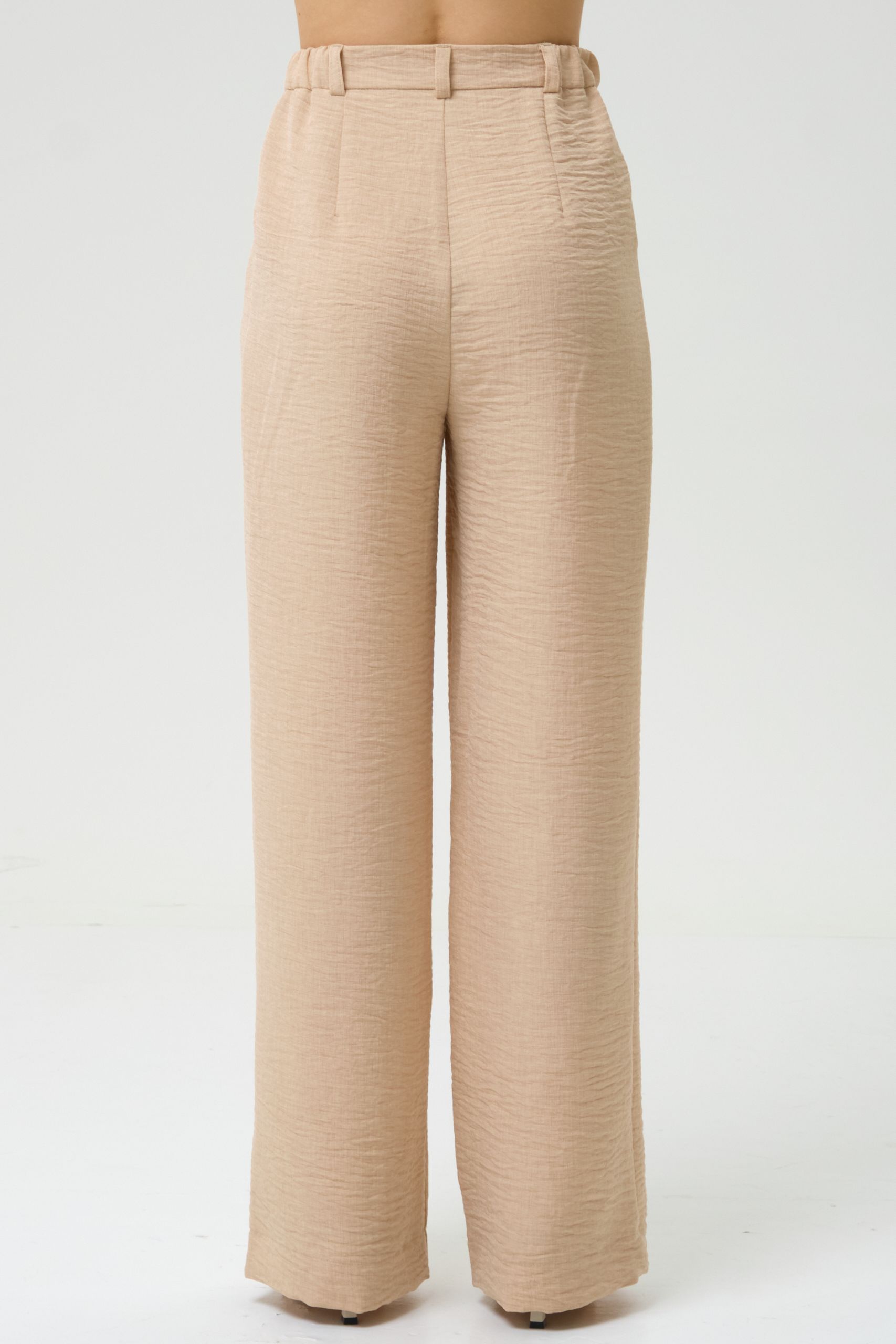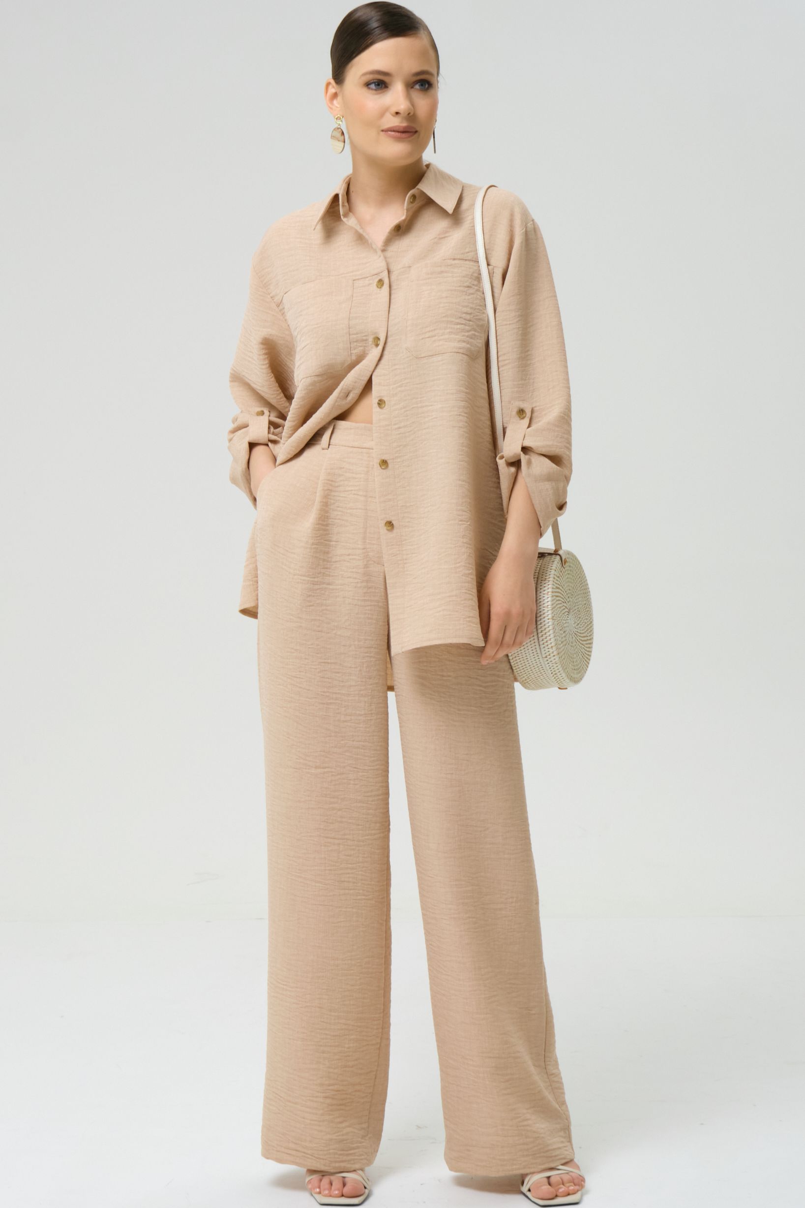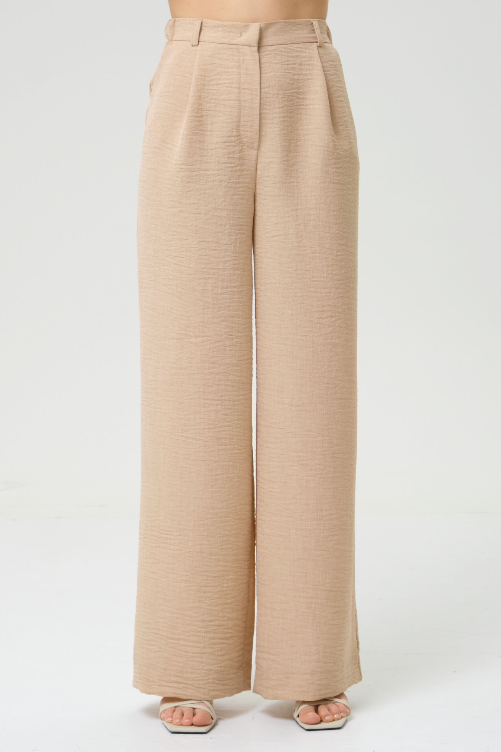 Брюки свободные с карманами от фабрики Priz, выполнены из текстильного полотна цвета сафарри. Модель на эластичном поясе со шлёвками. Спереди защипы, застёжка на молнию и пуговицу. Комфорт и стиль на каждый день.