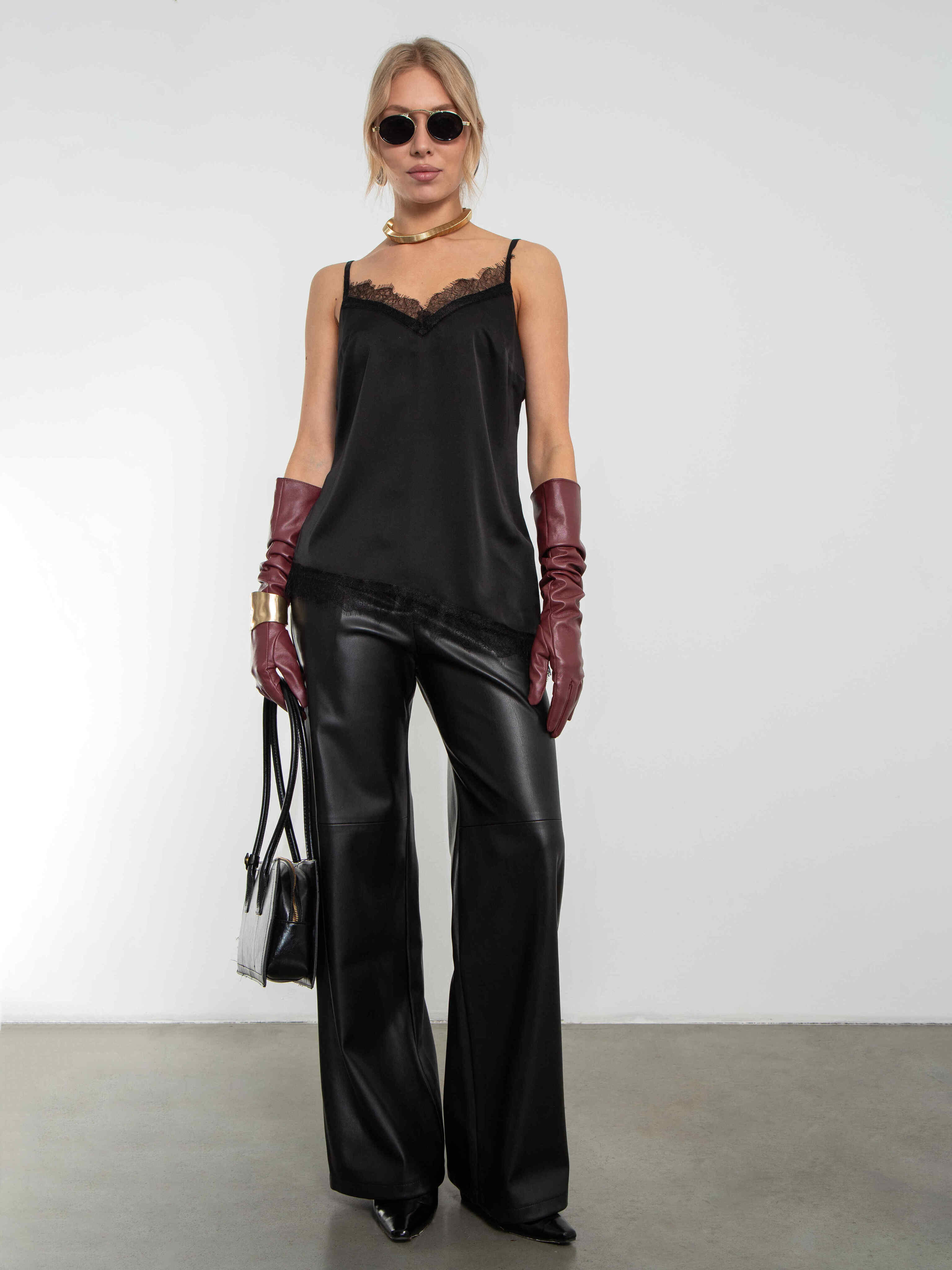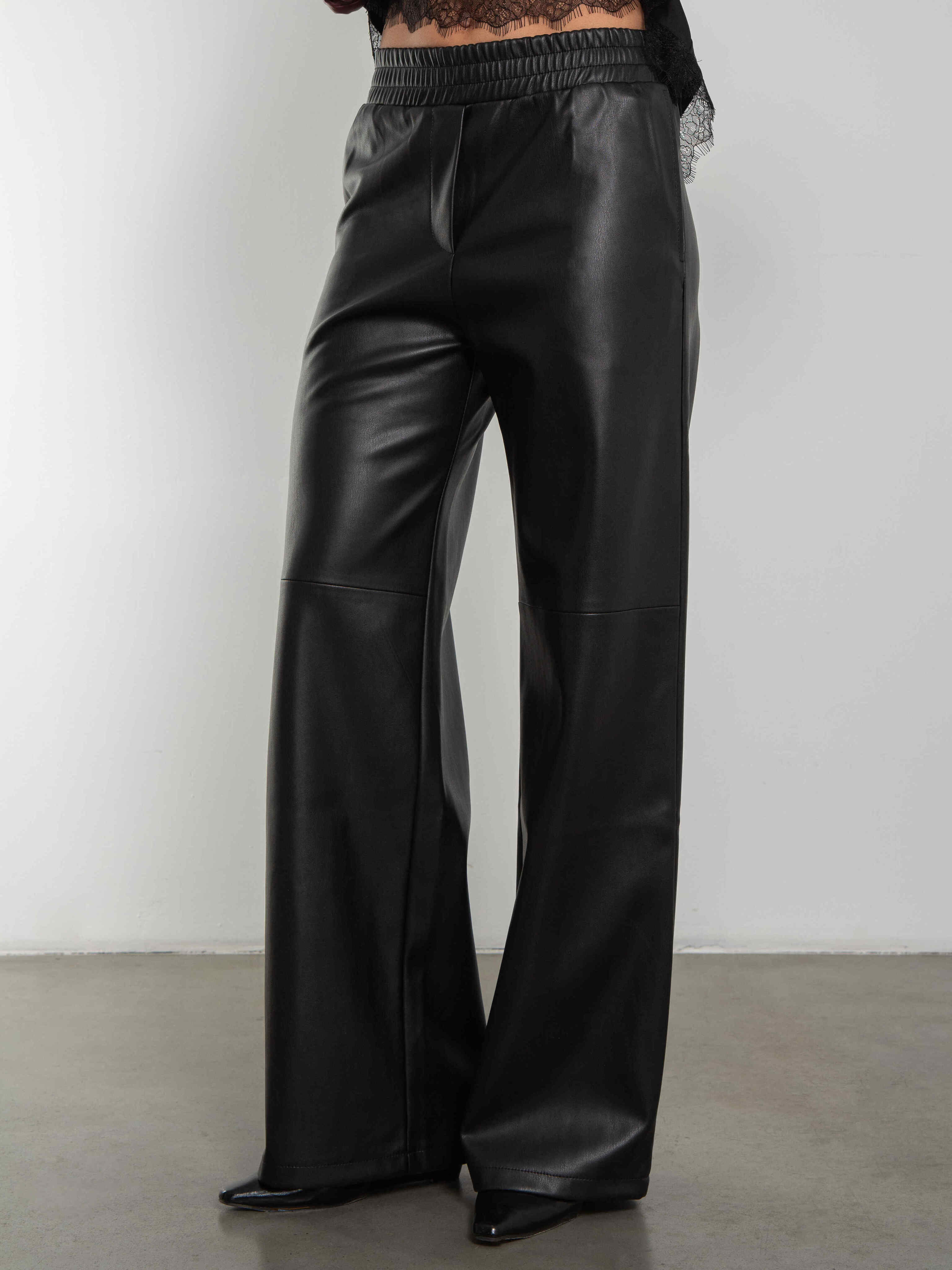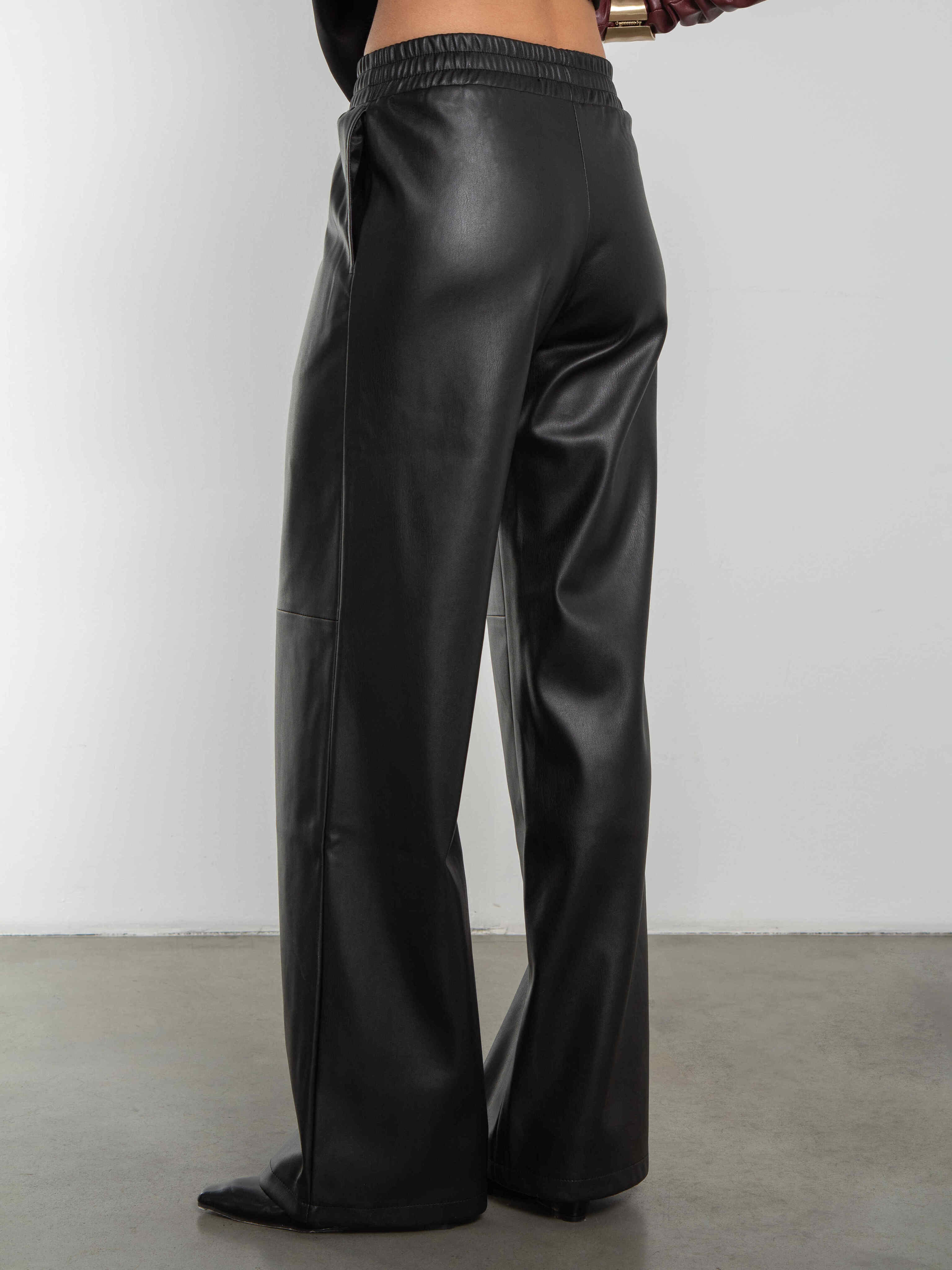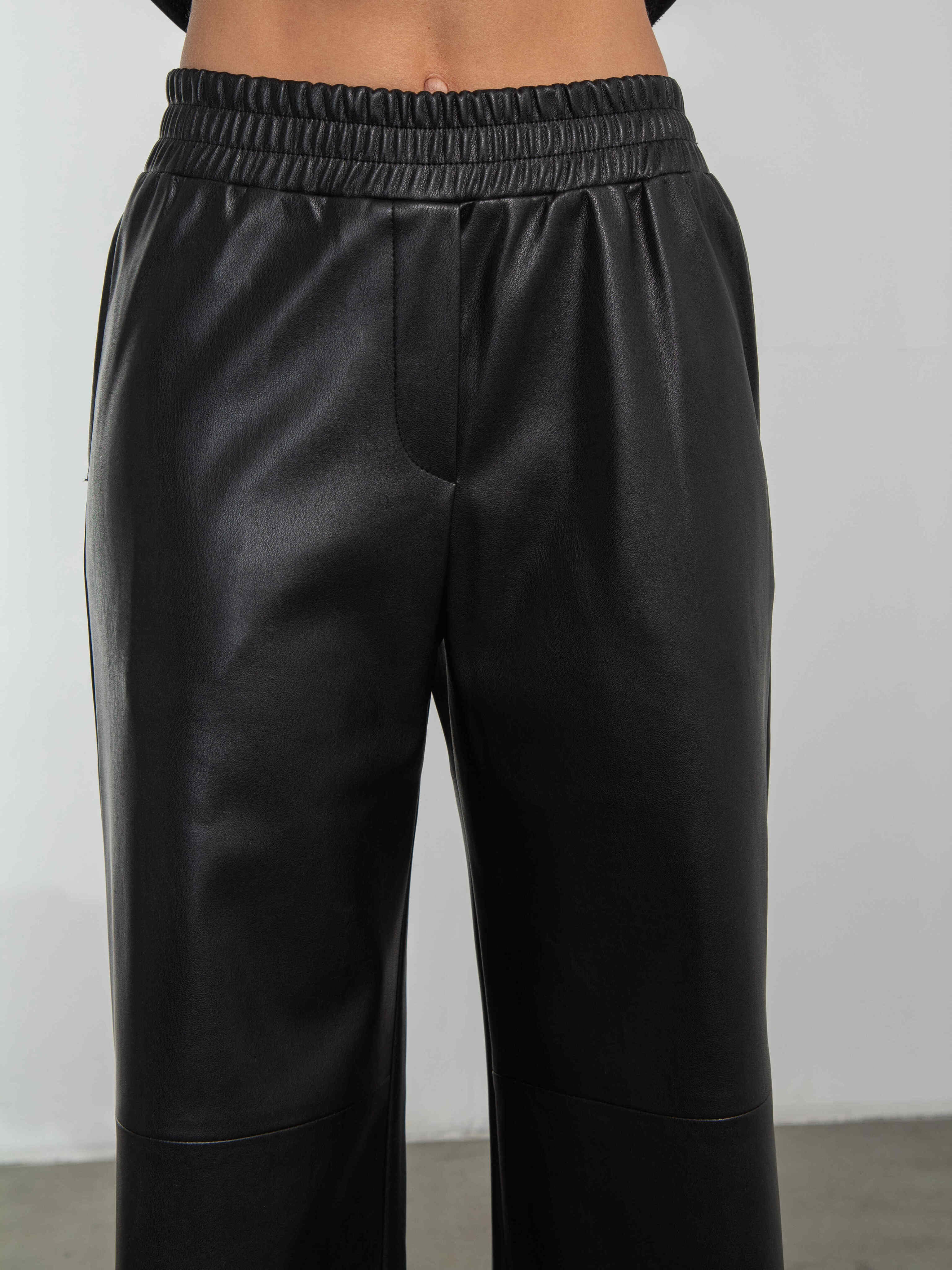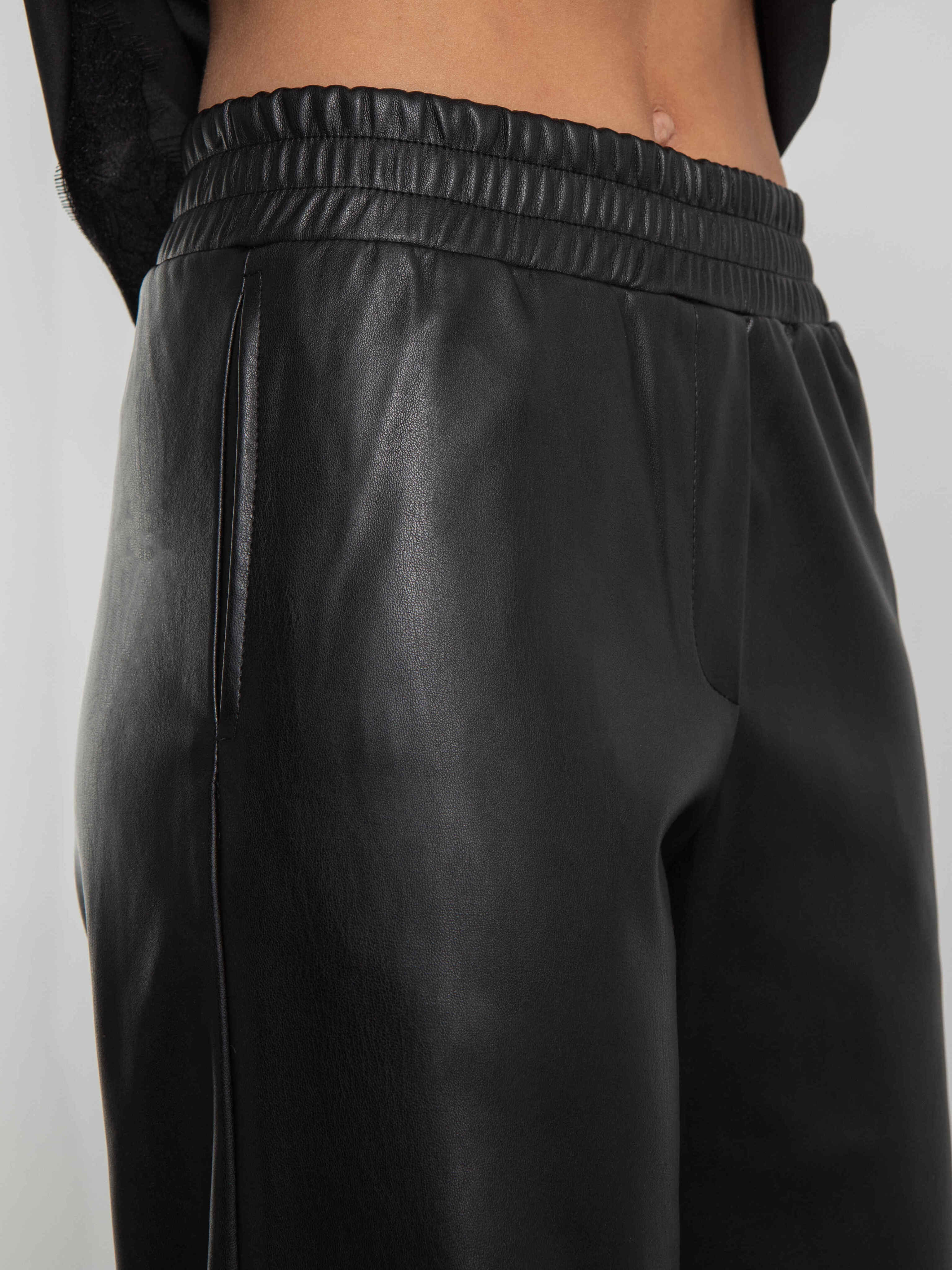 Брюки чёрные из экокожи на замше от бренда Kosmos. Брюки имеют свободный крой, что обеспечивает идеальную посадку и комфорт при ношении. Они оснащены удобной резинкой на поясе, которая обеспечивает идеальную посадку и не стесняет движения. Брюки также имеют удобные карманы. Этот стильный и практичный предмет гардероба подойдет как для повседневного образа, так и для особых случаев.