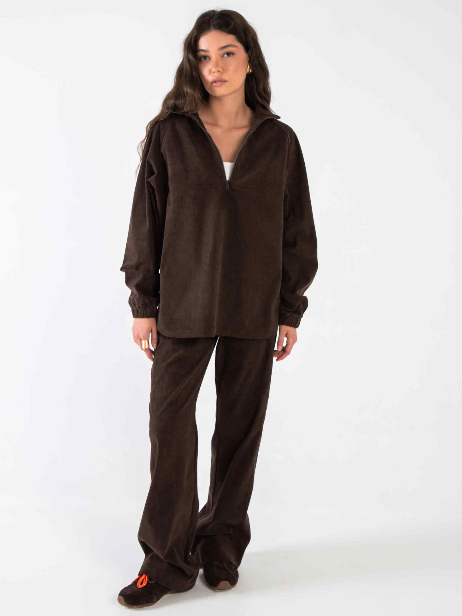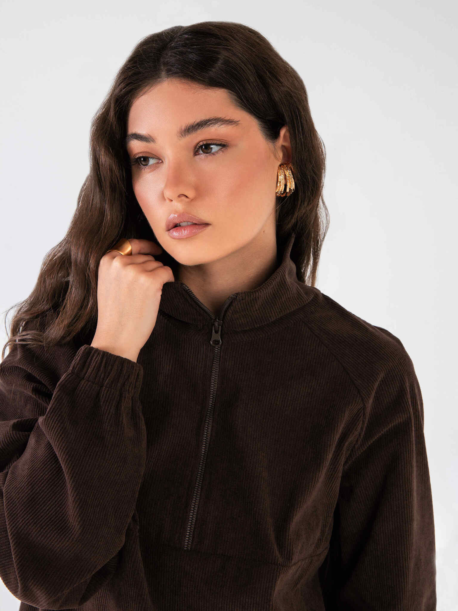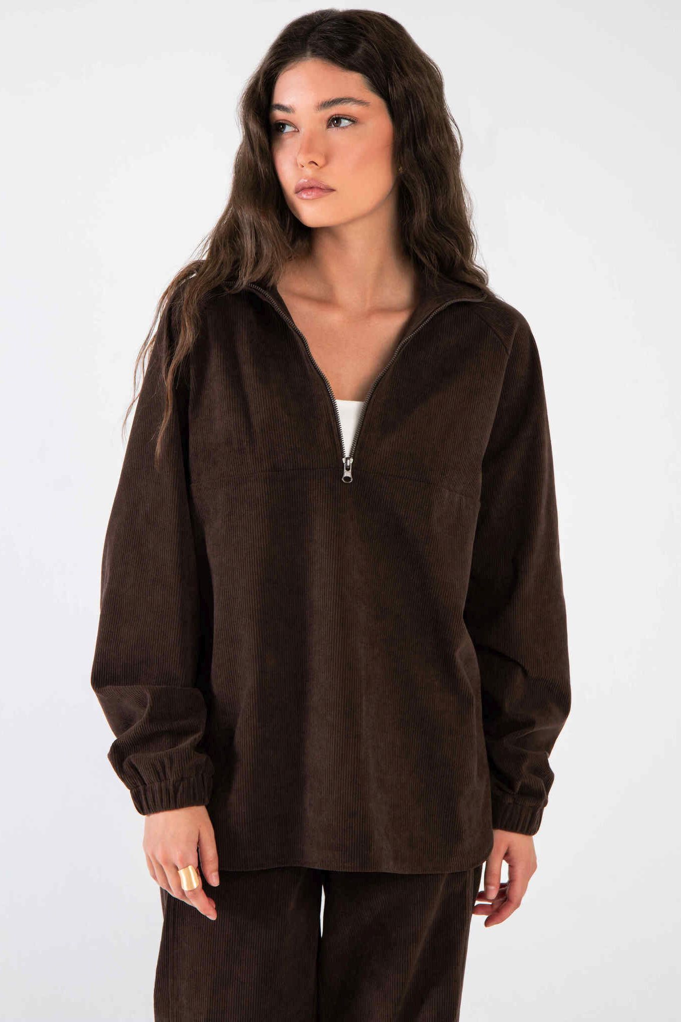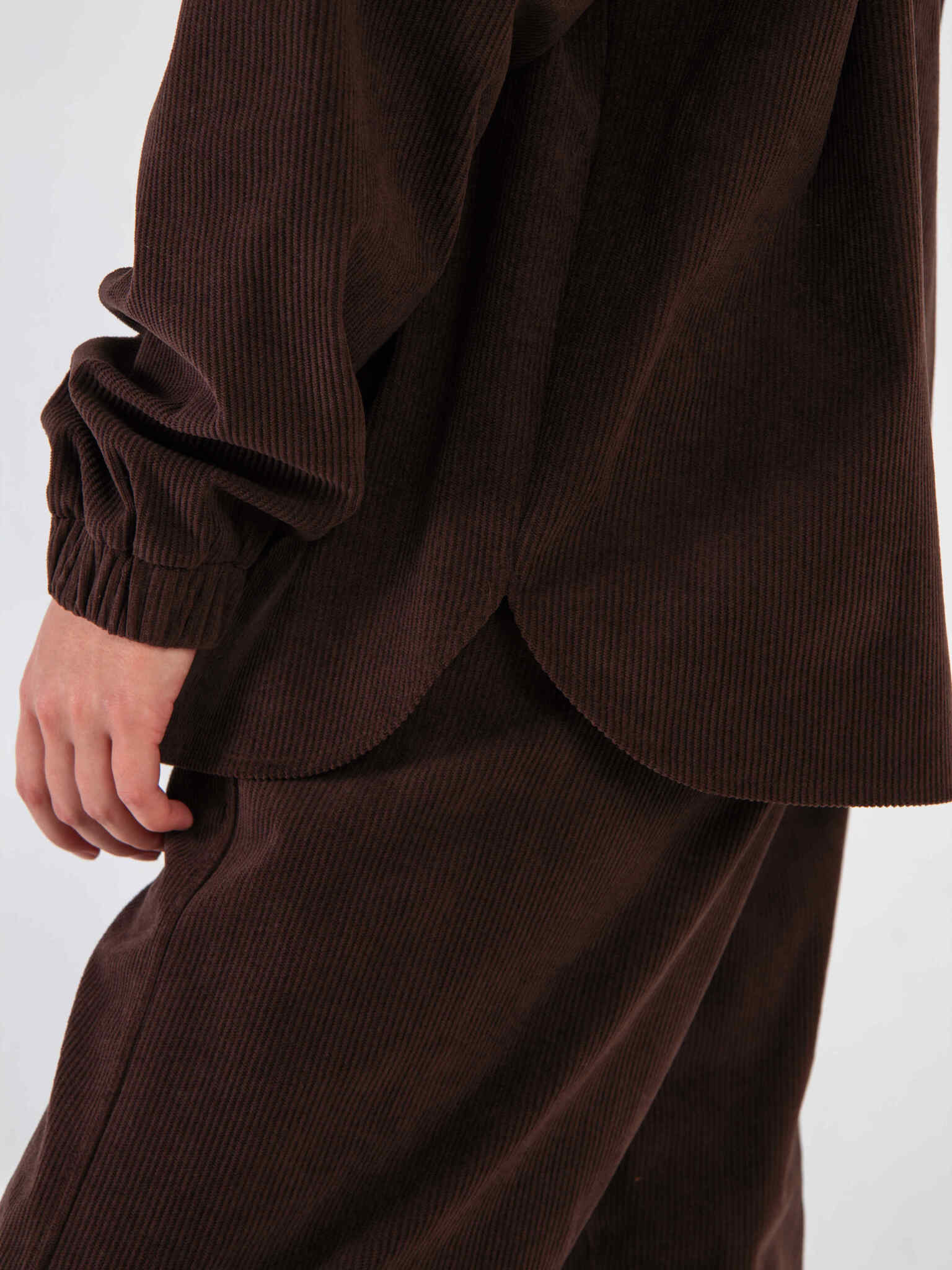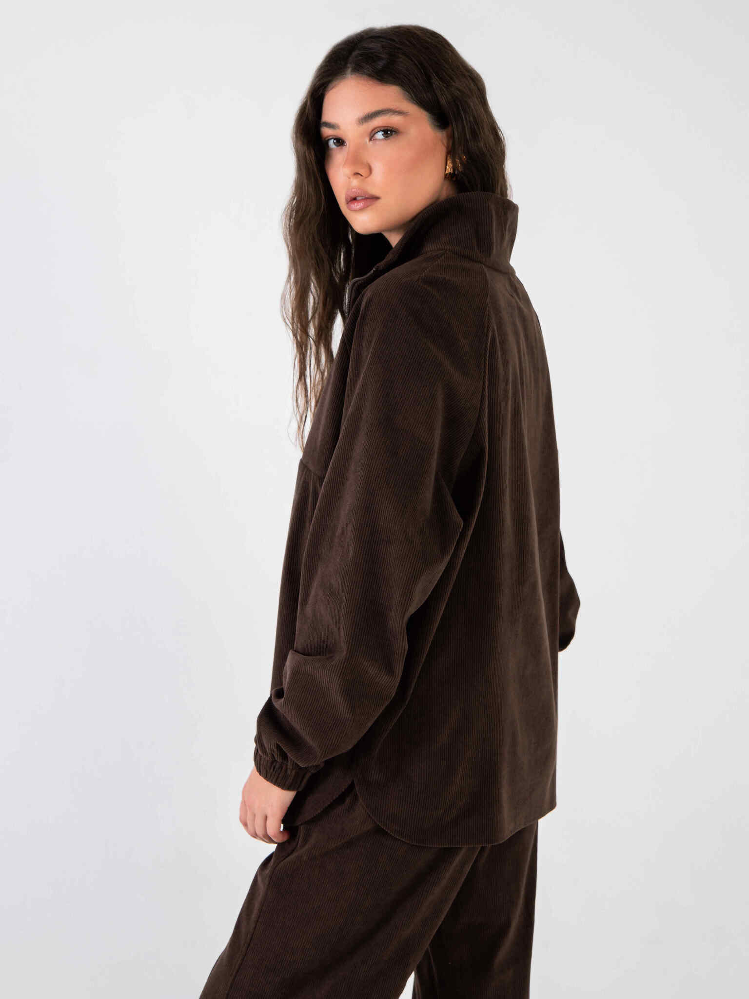 Анорак вельветовый тёмно-коричневого цвета от бренда Kosmos. Модель свободного прямого силуэта, с прямым низом. Длинные рукава посажены на резинку. Анорак дополнен застёжкой на молнию Универсальная модель актуального цвета прекрасно сочетается с базовыми джинсами, юбками и брюками.