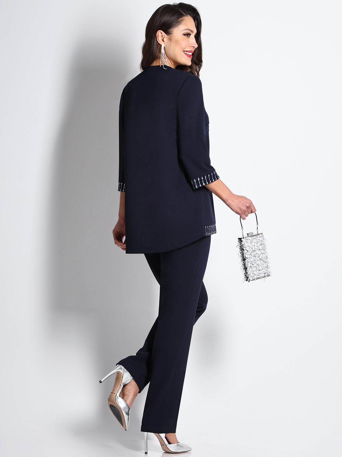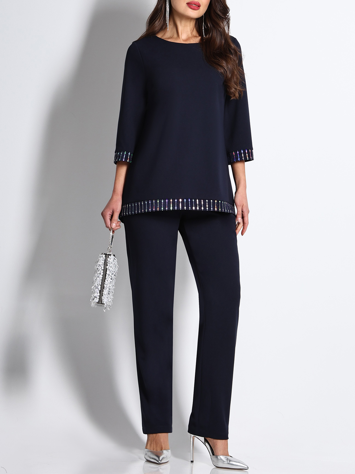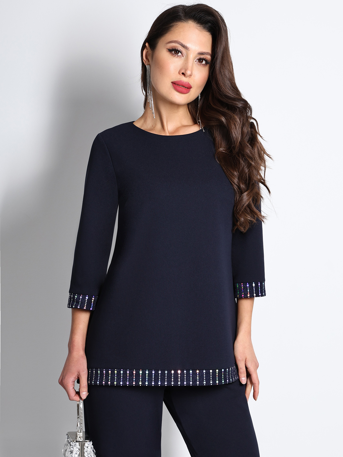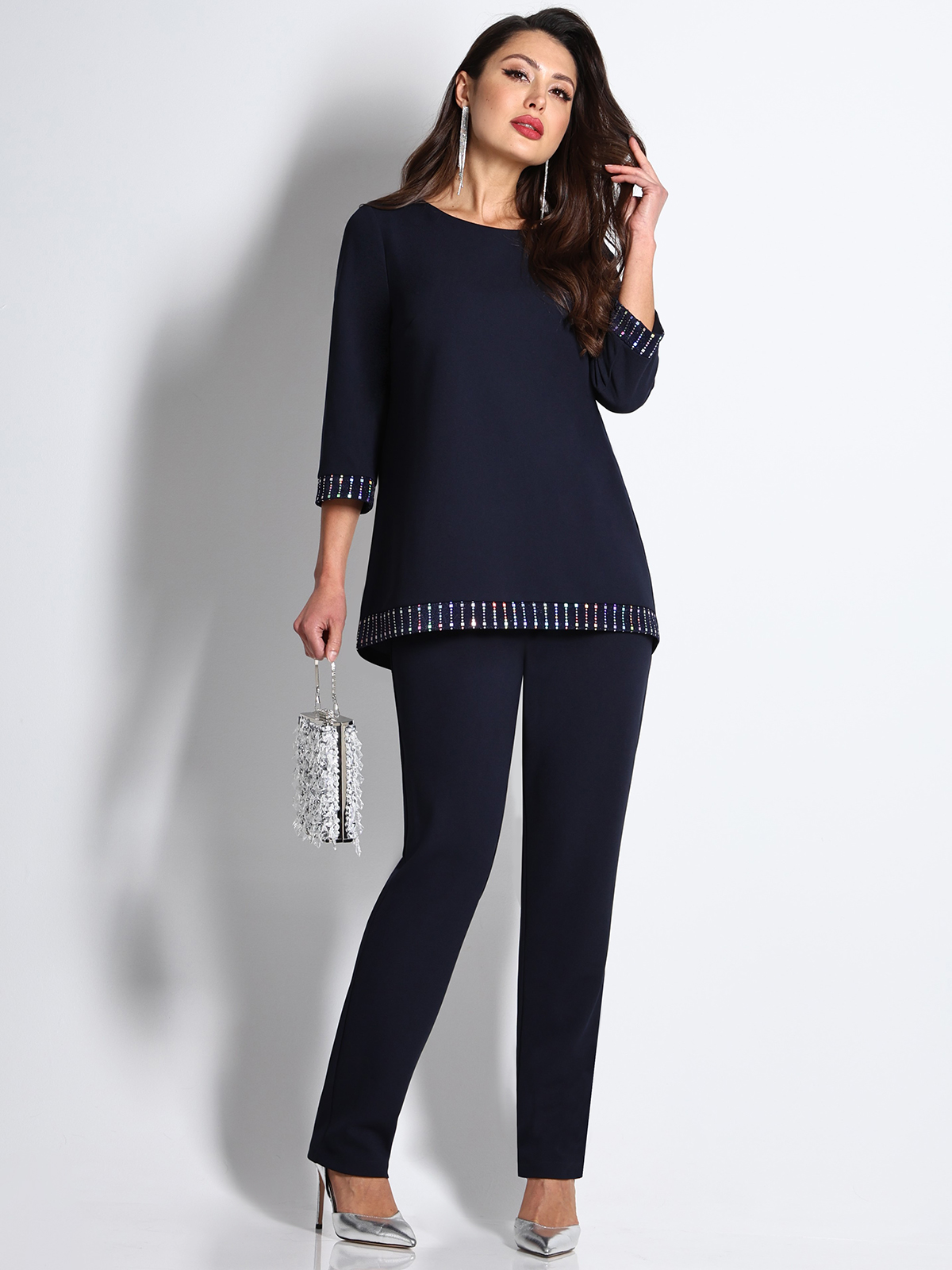 Костюм-двойка синий трикотажный с брюками от бренда SelenaSonata. Блузка свободного силуэта, с укороченными рукавами и круглым вырезом горловины. Низ рукавов и блузы с отделкой из пайеток. Брюки прямые, без застёжки. Пояс на резинке. Идеальный выбор для Вашего праздничного гардероба.