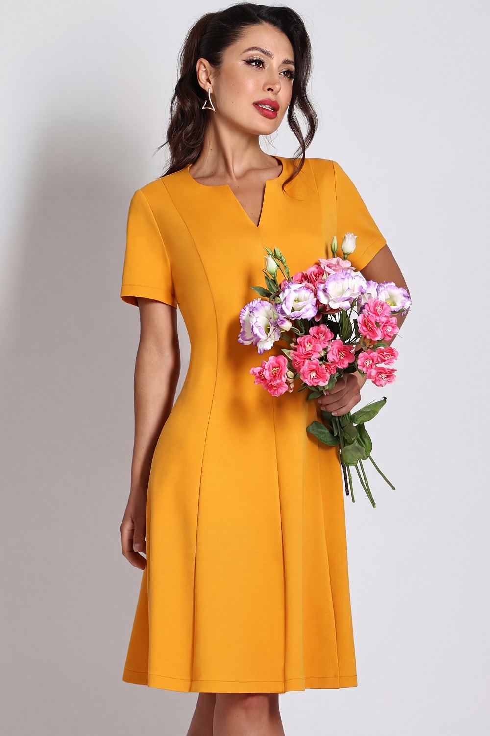 Платье повседневное женское от бренда SelenaSonata. Модель расширенного к низу силуэта, выполнена из плательно-костюмного полотна горчичного оттенка. Округлая горловина с V-образным вырезом. Рукав втачной, короткий. Застёжка-молния. Привлекательная модель для Вашего стильного гардероба. Рекомендуется бережная стирка при 30 градусах.