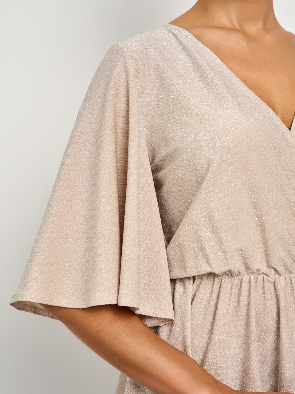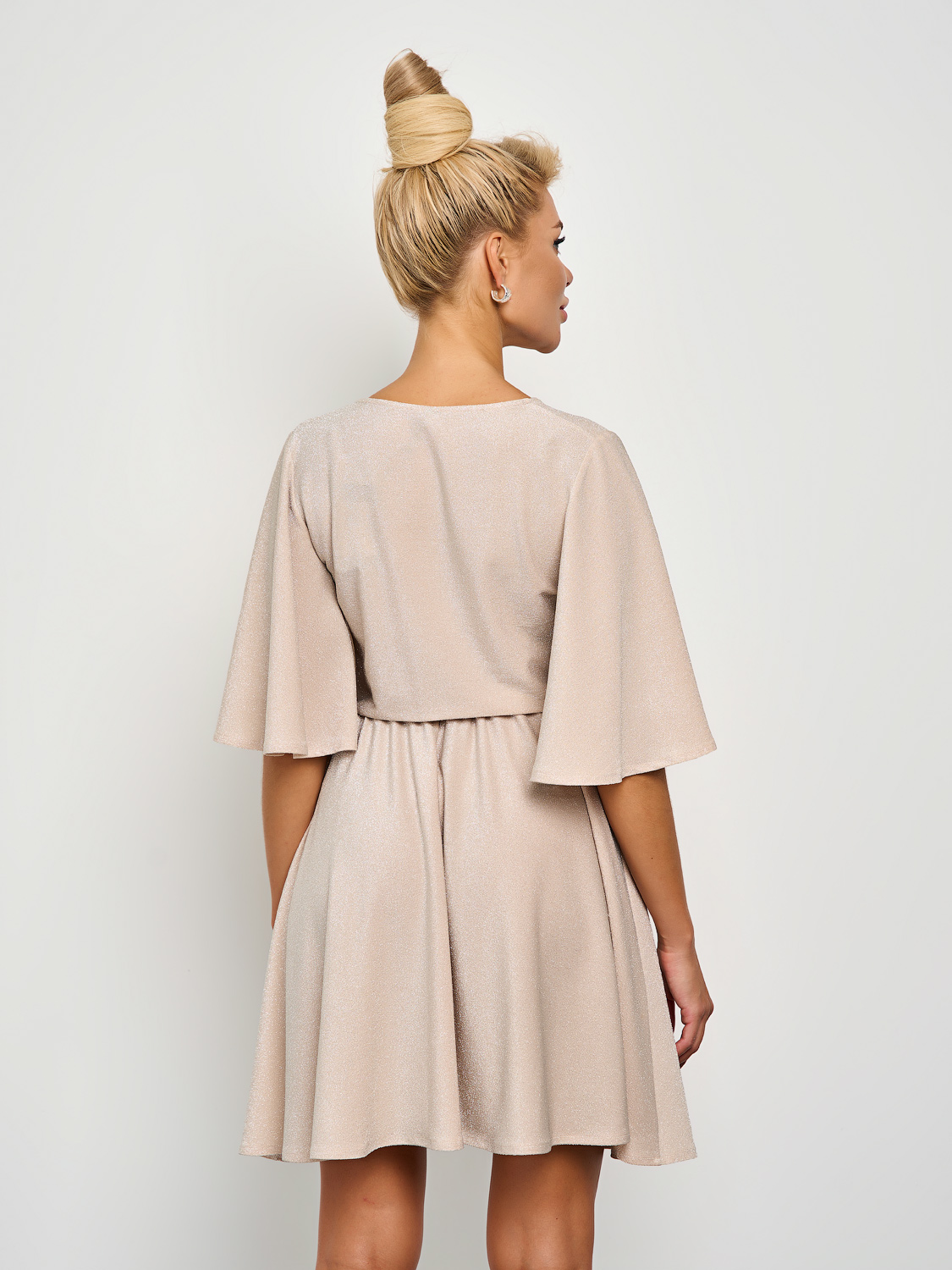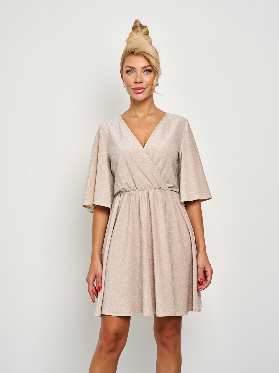 Платье короткое трикотажное с люрексом в золотисто-бежевом цвете от компании Jetty, Расклешенное платье, имитация запаха по переду верха. Талия отрезная, на резинке.