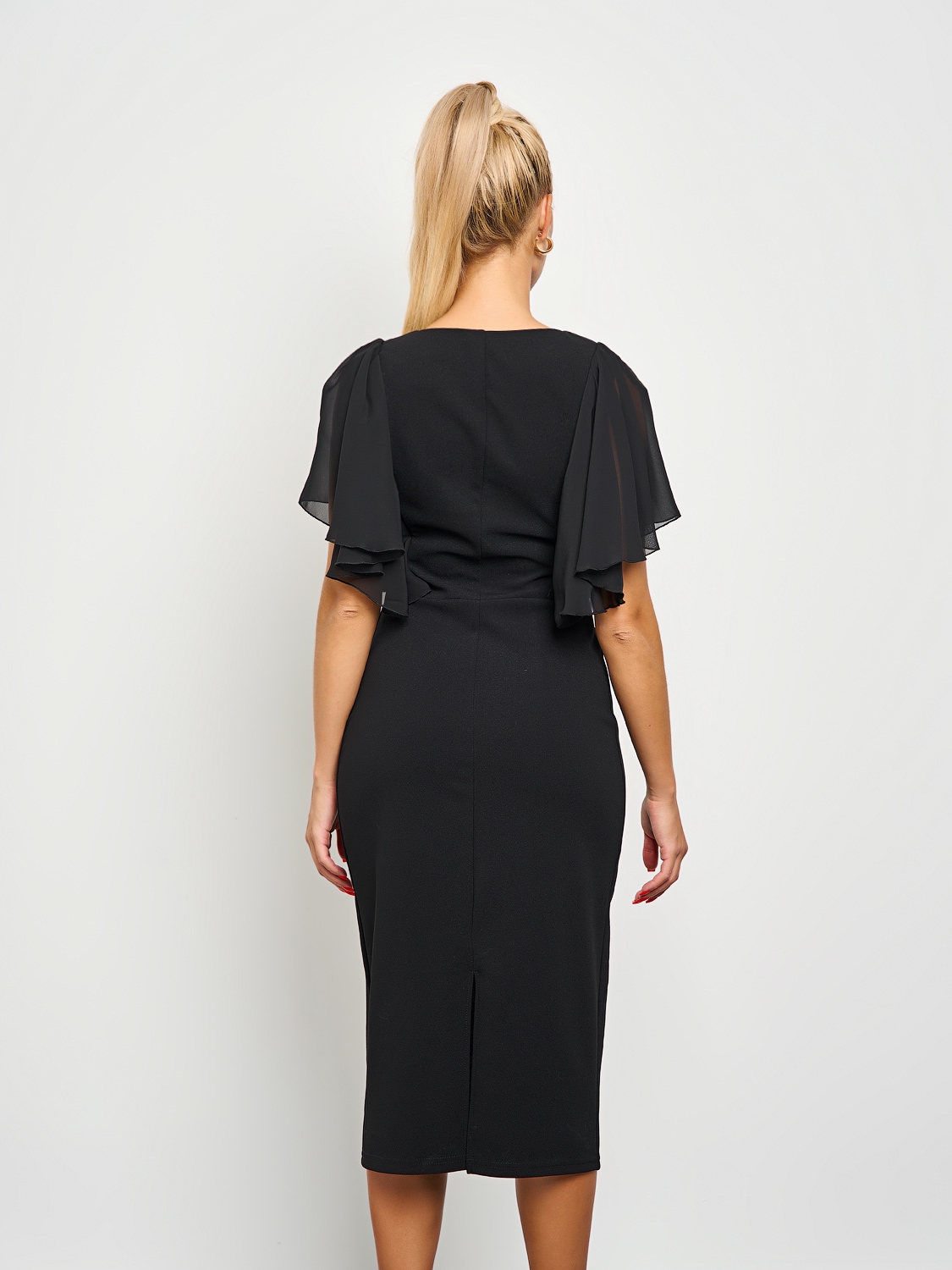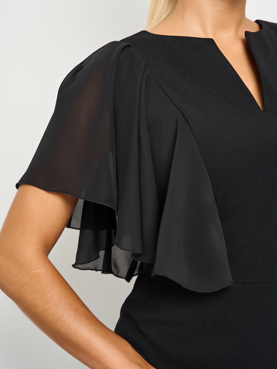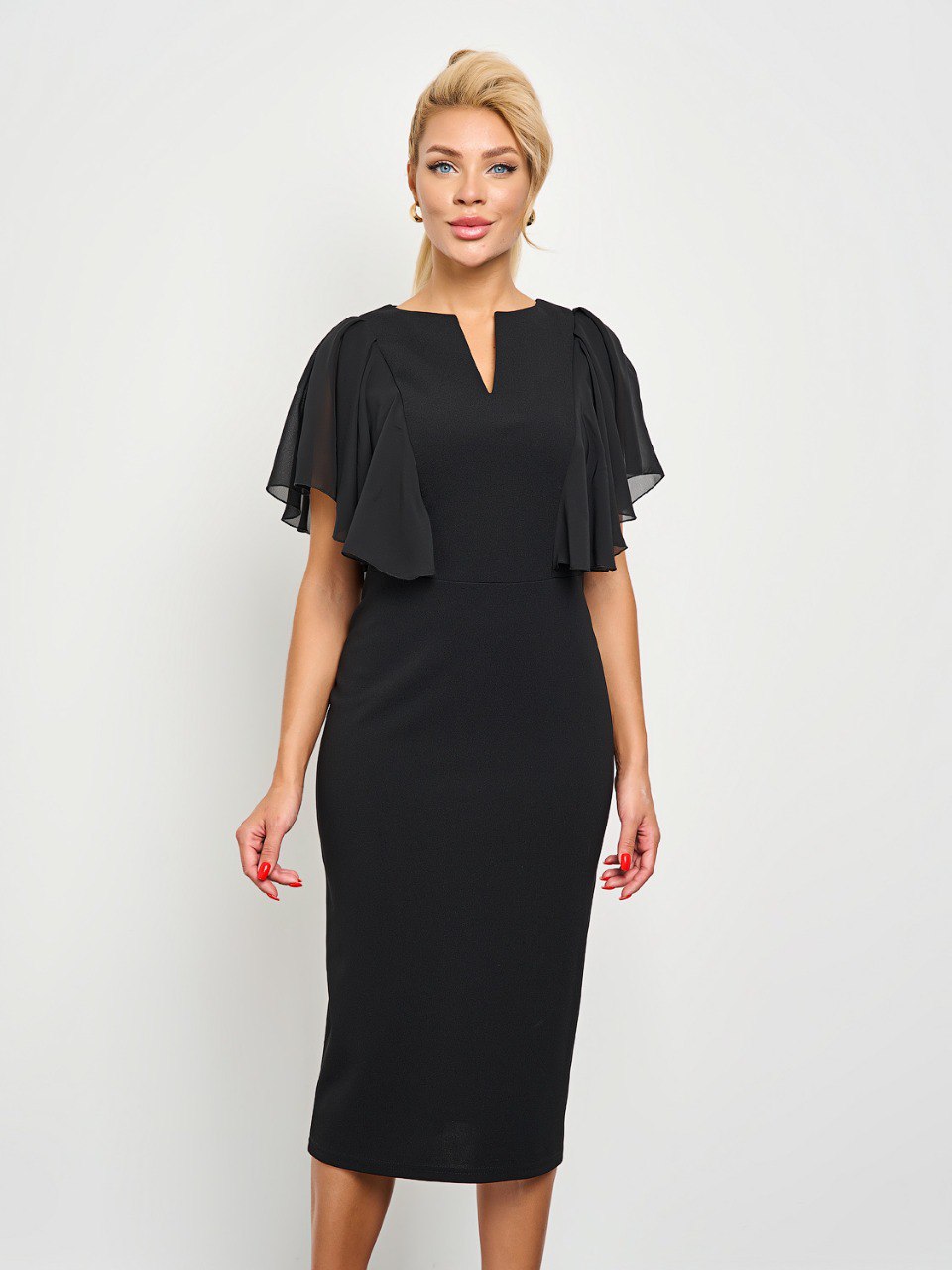 Платье-футляр трикотажное чёрное с рукавами из шифона от производителя Jetty. Модель прилегающего силуэта, круглый вырез горловины переходит в V-образный разрез. Линия талии отрезная. По спинке разрез. Идеальный выбор для создания вечернего образа.